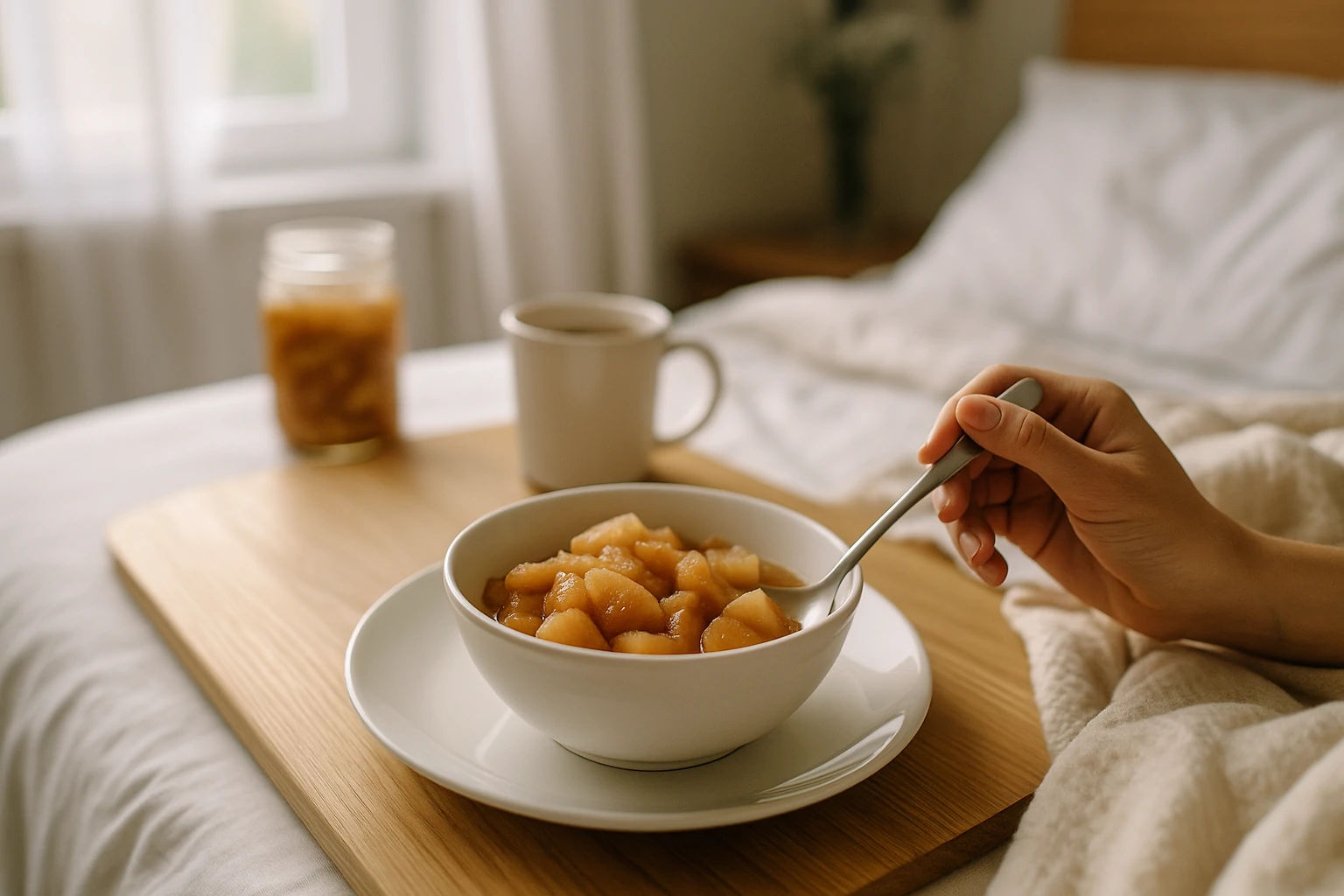 White bowl of stewed apples on a wooden tray beside a cup of tea and jar, served in bed during a calm morning with soft natural light