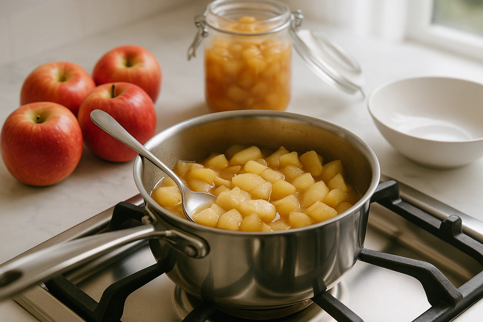 Sliced apples simmering in a stainless steel pot on a stovetop with fresh apples and a jar of stewed fruit in the background, under natural window light