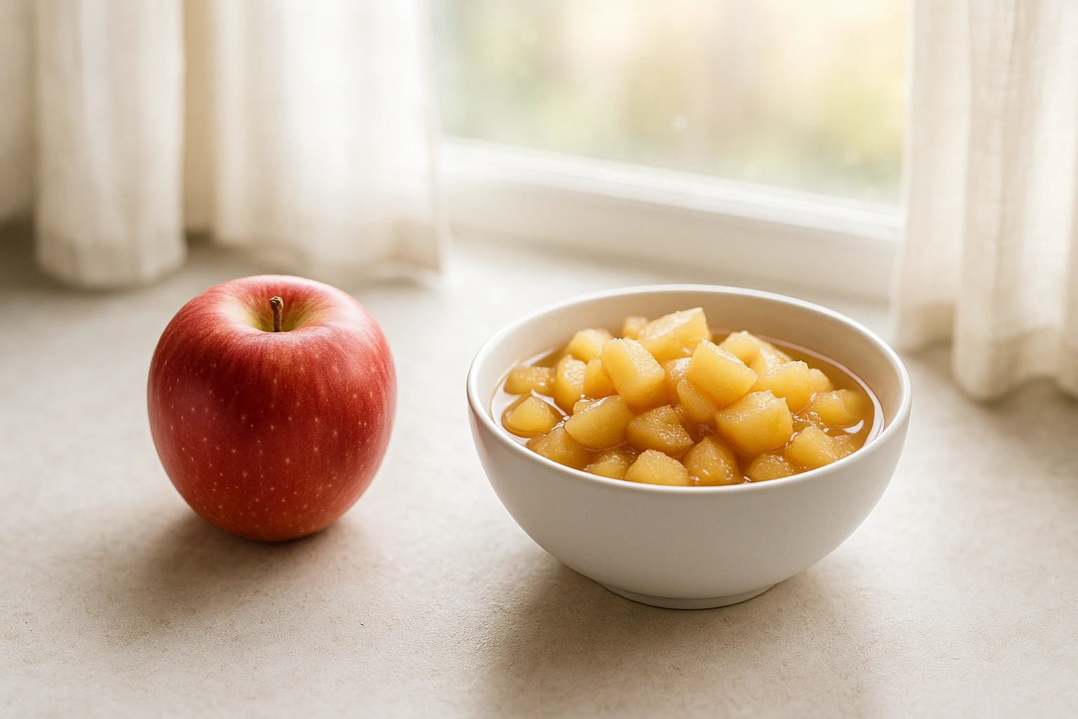 A DSLR photo of soft stewed apples in a bowl with morning light, symbolizing slow gut healing progress